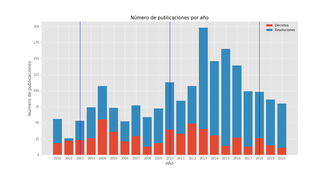 Dado lo anterior, el presente documento tiene como objetivo hacer el análisis exploratorio de los datos encontrados en la extracción de información no estructurada como los son textos en formato PDF. Así, se usarán los actos administrativos más relevantes de los entres de control como lo son los Decretos y las resoluciones, tomando el intervalo del año 2000 a mayo del 2020. En el análisis exploratorio se relacionarán indicadores macroeconómicos con el fin de dar insumos para investigaciones futuras de efectos causales y correlaciones estadísticas.